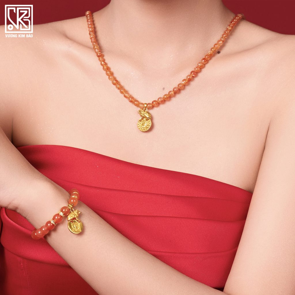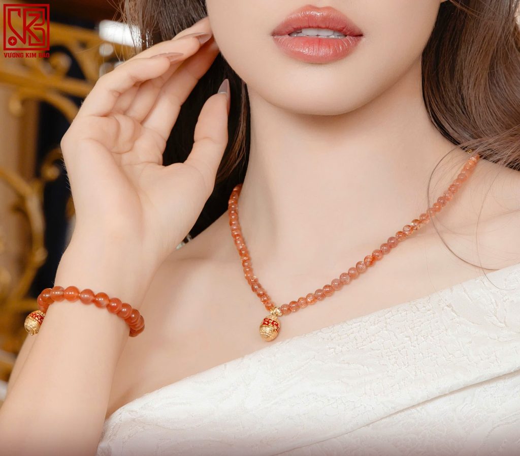 – ĐÁ: Nam hồng (7mm, đỏ cam), Thạch anh mặt trời (5mm).